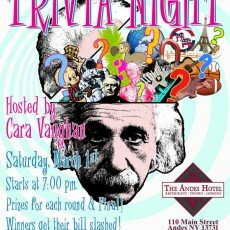 7.10-8.28 EVERY THURSDAY-TRIVIA NITE, 7pm Every Thursday at 7pm in the Tavern with host Cara Vaughan. Teams of 1 to 7 people. Great prizes for each round and final. Winners get their bill slashed in half! ...